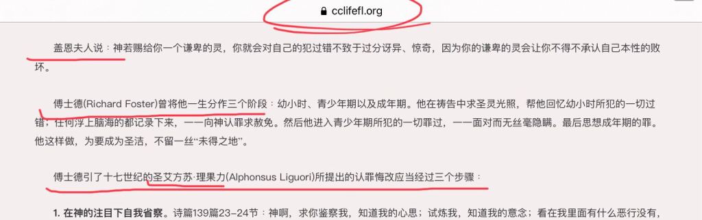 “傅士德 (Richard Foster)曾将他一生分作三个阶段﹕幼小时、青少年期以及成年期。他在祷告中求圣灵光照,帮他回忆幼小时所犯的一切过错;任何浮上脑海的都记录下来,一一向神认罪求赦免。然后他进入青少年期所犯的一切罪过,一一面对而无丝毫隐瞒。最后思想成年期的罪。他这样做,为要成为圣洁,不留一丝“未得之地”。傅士德引了十七世纪的圣艾方苏·理果力(Alphonsus Liguori)所提出的认罪悔改应当经过三个步骤。”(原文截图如下)