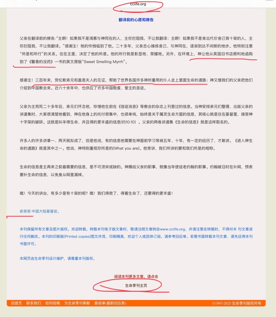 “在环境上,神让他(俞成华)从英国旧书店顺利地函购到了《馨香的没药》一书的英文原版 Sweet Smelling Myrrh。感谢主!三百年来,劳伦斯弟兄和盖恩夫人的见证,帮助了世界各国许多神所重用的仆人走上里面生命的道路;神又借我们的父亲把他们介绍到中国教会来。近六十余年中,也供应了许多中国敬虔、爱主的圣徒。” 看下面截图: