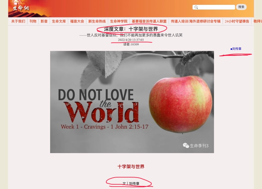 2022年4月20日 ,生命季刊发表了一篇刘传章牧师的文章:《深度文章:十字架与世界》文章里引了傅士德(Richard Foster)的书《金钱、性与权力》里的三句话,“鬼魔在钱中就是贪心;鬼魔在性里面就是情欲;鬼魔在权里就是骄傲。” 文章相关部分截图如下: