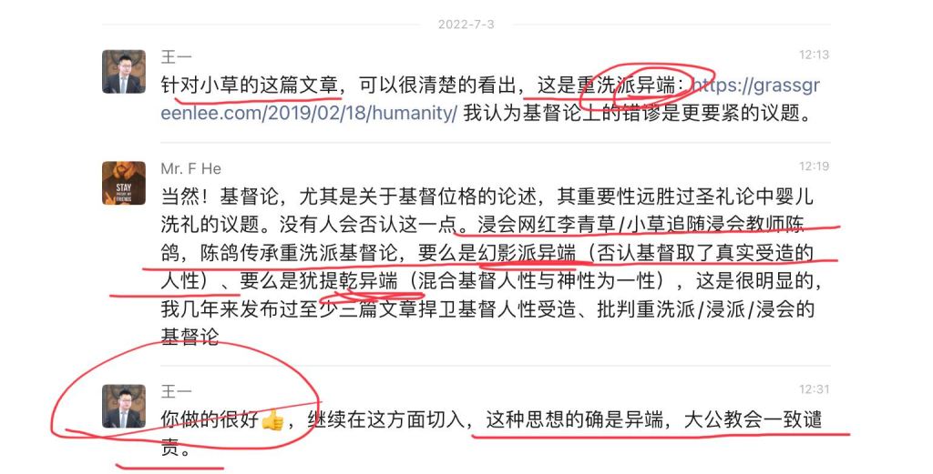 在上面这段聊天记录里,何奇伟(Mr.F He)说陈鸽和我是传承重洗派基督论,要么是幻影派异端,要么是犹提乾异端,还说这是很明显的。这纯属是何奇伟一惯的乱定异端的恶行的又一次表现。