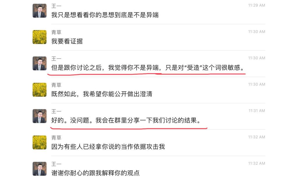 王一也答应,会在微信群里分享他与我讨论的结果,作为他之前说我是异端的澄清。所以我也在此文公开我们之间的这一小段对话内容,也是作为对此事的一个公开澄清。