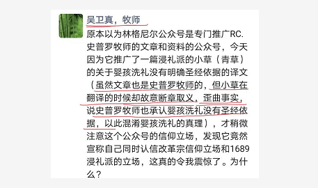 事实上,胡才飞、吴卫真、何奇伟他们这些极端分子与史普罗本来就不是一个立场的,史普罗一直是反对婴儿洗礼的约翰.麦克阿瑟(John MacArthur)亲密的盟友,这都是关注他们的基督徒所众所周知的事。既然与史普罗不一致,还怕人家知道,真是虚谎得可笑!他们怕人家知道真相,怕人家知道史普罗真实的立场和观点,就靠毁谤和诬蔑我,靠去林格尼尔公号里闹,以致公号把文章删掉。以如此恶劣的手段来掩盖真相和做假见证陷害我,这还像是基督徒吗?还像是在乎真理的人吗?