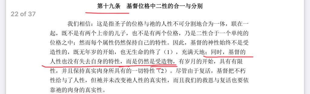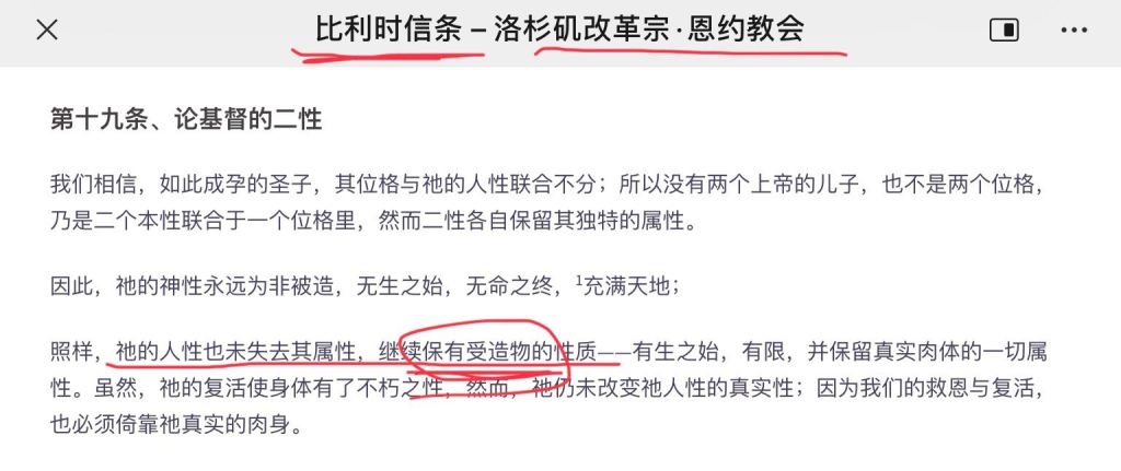 但事实上,《比利时信条19》里并没有 “他的人性总是受造的 ”这样的词语。赵中辉牧师对《比利时信条19》里相应的这段话的翻译是,“因此神性总是非被造,无生之始,无命之终1,充满天地;所以也有他的人性并未失去其属性,既为有限,就具有真实肉体的一切属性。” 见下面截图: