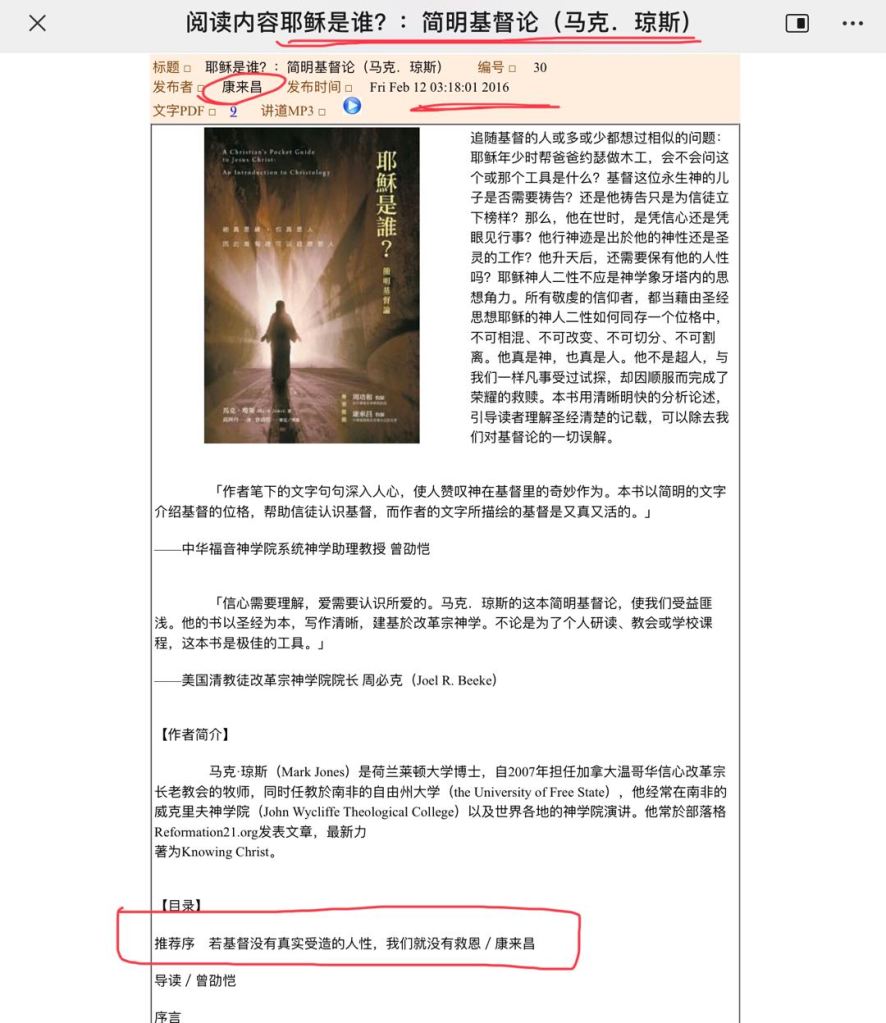 至于说《比利时信条》有基督人性受造的条款,这就是一个比较混乱的情形。根据我的了解,最早引用《比利时信条》来论证基督人性受造的是康来昌牧师,是在他2016年的《若基督没有真实受造的人性,我们就没有救恩/康来昌》一文里。此文不仅发表在他自己的网站上,也是《耶稣是谁?:简明基督论(马克.琼斯)》一书的推荐序文(见文后所附截图)。