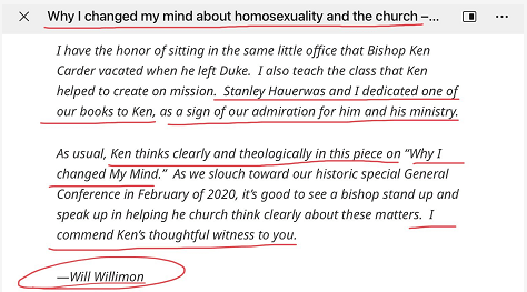魏利蒙是美国杜克大学的神学院的教授,美国大学里自由派是占主流,世俗大学里的神学院就更是自由派的神学。魏利蒙在他个人的网站上称赞和转发了卫理公会的主教 Ken Carder 2018年发表的《Why I changed my mind about homosexuality and the church》(为什么我改变了对同性恋和教会的看法),Ken Carder曾是杜克大学的神学院的教授。Ken Carder 在这篇文章里要表示的意思是,一个人可以同时是敬虔的基督徒也可以是LGBTQ。Ken Carder 说,“Some are people in same-sex marriages who are committed Christians and faithful to the church, faithful to one another, and faithful to Christ, and who possess “the gifts of the Spirit.” (意思是:有些在同性婚姻里的人,他们是委身的基督徒,忠心于教会,彼此相互忠心,并对基督忠心,他们拥有圣灵的恩赐。)