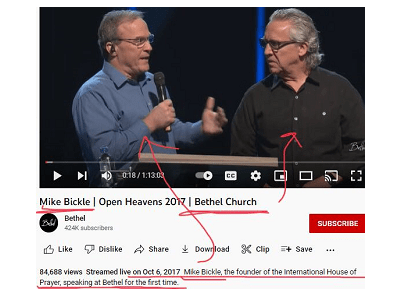 毕迈克与比尔.强生关系密切,无非是同路人,都是假先知、假师傅。2017年,毕麦克首次到比尔.强生的伯特利教会(Bethel Church),视频截图如下,左为毕麦克,右为比尔.强生: