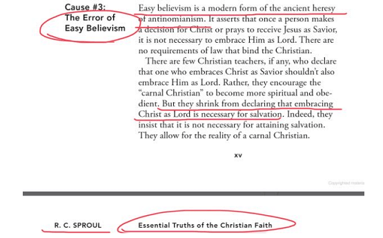史普罗(R C Sproul)牧师在他的《Essential Truths of The Christian Faith》(基督教信仰的基本真理)一书里说,“简信主义是古老的反律主义异端的现代形式。简信主义者虽然会鼓励更属灵和顺服,但是他们不愿声称接受基督为主是得救所必须的。” 完整的原文见下面截图: