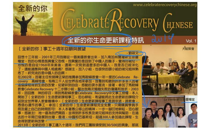 这几年开始在一些华人教会里出现的《全新的你:生命更新课程》是源自美国加州的马鞍峰 (Saddleback) 教会,也就是华理克(Rick Warren)创办和牧养的教会。课程的英文名为 Celebrate Recovery ( 庆祝恢复)。2003年,美国加州尔湾新生命灵粮堂的刘筱文女士把这套课程翻译成中文,并称之为《全新的你》,开始在华人里推广。下图是截自中文的 《全新的你》2014年的简报,有对这个课程的简介: