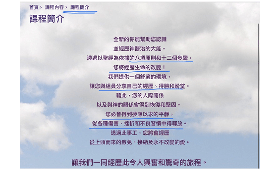 当然,这套课程也不是要在信仰上进深,更多的是为了处理学员心理上和行为上的问题,他们称之为:“从各种伤害、挫折和不良习惯中得释放。” 下图是截自《全新的你》官网上对课程的简介:
