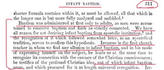 “起初洗礼只给成年人施行,因为人们习惯于将洗礼和信仰视为严格联系在一起的。 我们有充分的理由不认为婴儿洗礼是来自使徒的教导,而后来对它的承认,作为使徒的传统,这也证实了这个假设。爱任纽(Irenaeus)是我们所找到的第一位暗示婴儿洗礼的教会教师。”