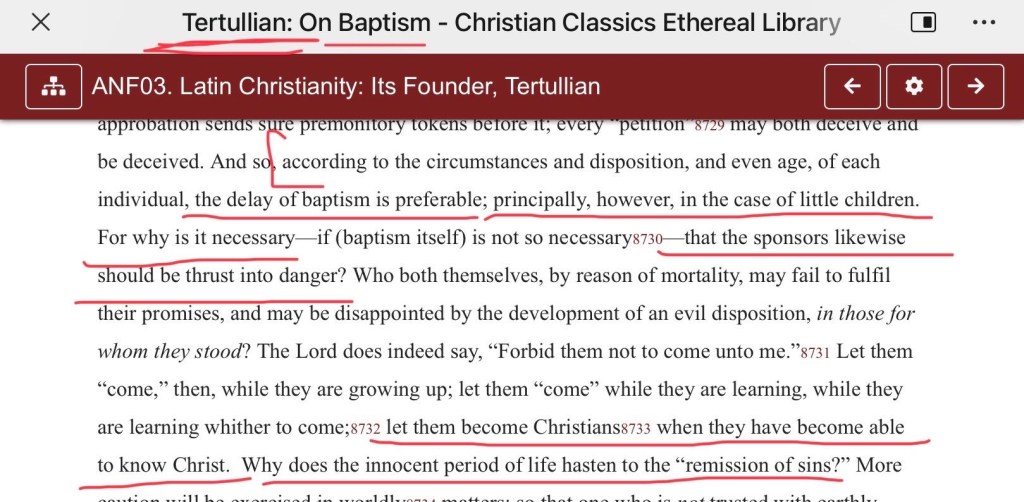 “根据每个人的情况和性情,甚至年龄,推迟受洗是可取的;然而,主要是对小孩子的情况。因为如果(洗礼本身)不是那么必要的话,为什么要把担保人置于危险之中呢?他们要么因死亡而无法兑现承诺,要么可能因他们所代表的孩子的邪恶倾向的发展而失望。主确实说过:”不要禁止他们到我这里来。” 那么,让他们在成长过程中 “来 “吧;让他们在学习过程中 “来 “吧,让他们在学习如何来时“来”吧;让他们在能够认识基督时成为基督徒。为什么在生命的幼稚期要赶紧“免除罪”呢 ?