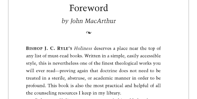 转注:本文是节录自莱尔的《圣洁》(Holiness)一书,这是莱尔的经典之作。约翰.麦克阿瑟(John MacArthur)对这本书的2010年英文再版写了推荐前言(Foreword)。麦克阿瑟在前言里说,“在任何的必读书籍中,莱尔的《圣洁》都应当被排在前面。这是你将读到的最优秀的神学著作之一。”(见下面截图)