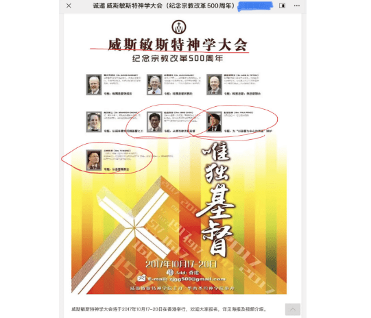 西敏神学大会所请的讲员在信仰上有问题也不是今年才发生的,疫情前的2017年10月的大会,所请的讲员里有王怡,陈彪,彭强,见下面2017年的大会海报:
