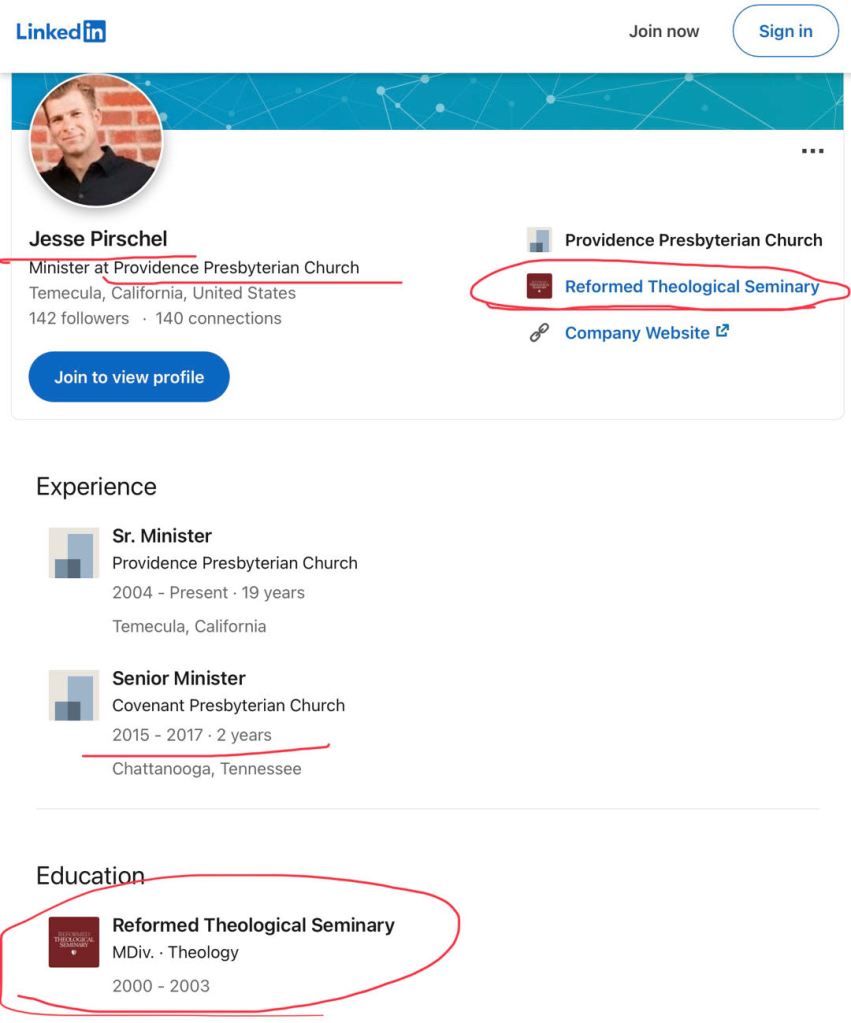 我要指出的是,普杰西(Jesse Pirschel)并不是西敏神学院毕业的,他是改革宗神学院(Reformed Theological Seminary)的硕士毕业,也不是博士毕业。下面就是普杰西在他的Linkedin上对他自己毕业的学校和学位的介绍: