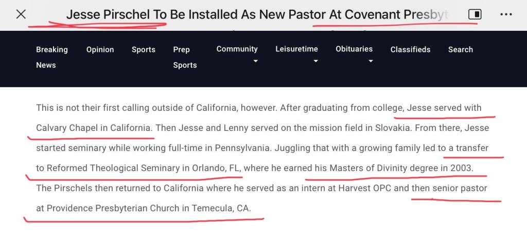 在上面这个介绍里说他,普杰西更早的时候是在加州的 Calvary Chapel 服侍,这是个很出名的灵恩派教会。这里也说到,他是2003年从改革宗神学院毕业的,获硕士学位。再次证明他不是西敏神学院毕业的,也不是博士。