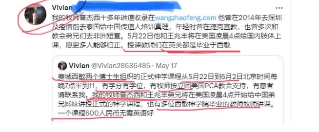 发出这个广告的 Vivian 目前在普杰西的教会里,她声称,“西敏神学院博士们组织”,“教师团都是英美国家西敏毕业的”,这次的课程是由普杰西(Jesse Pirschel)担任教师。