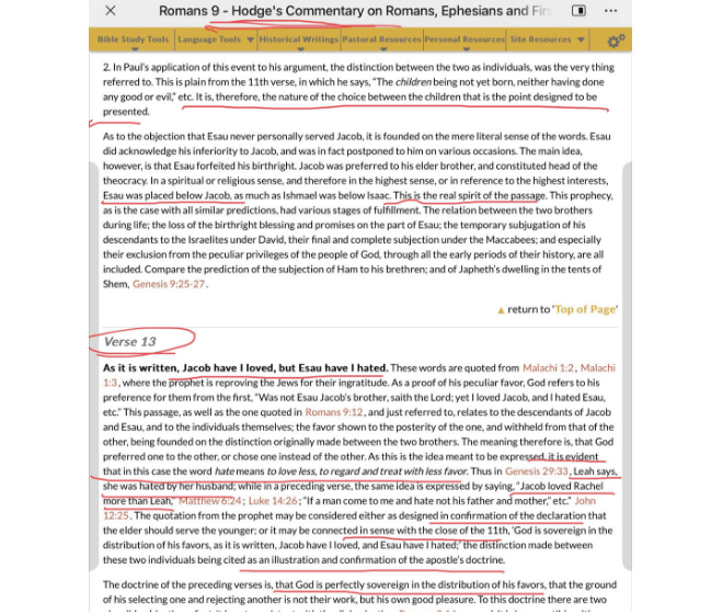 译注:老普林斯顿的改革宗神学家贺智(Charles Hodge 1797年 – 1878年)对“雅各是我所爱的,以扫是我所恶的。”这节经文的解释与史普罗非常类似,或者应该说,史普罗对这节经文的解释与在他之前的贺智的解释是相当一致的。贺智(罗9:13)的注释原文附在下面: