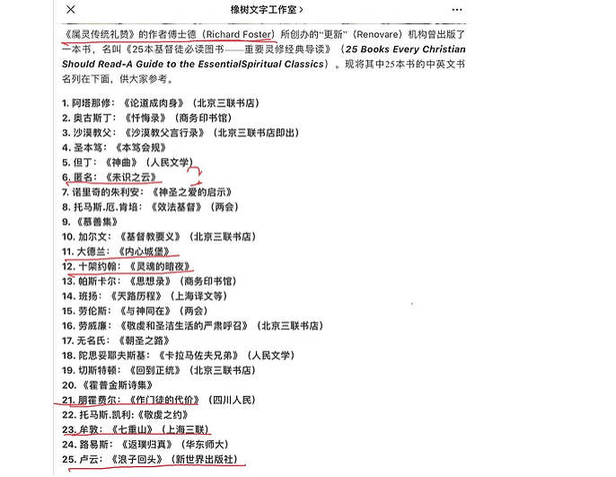 但是,橡树推荐的25本基督徒必读书里(见下面截图),却有数本是出自天主教的一些异端人士。把这些书推荐进华人教会,会误导多少人?造成多大的危害?