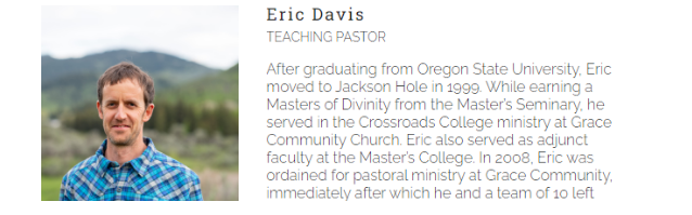 Eric Davis 获主人神学院(Master Seminary)的神学硕士学位,2008年被按立为牧师。