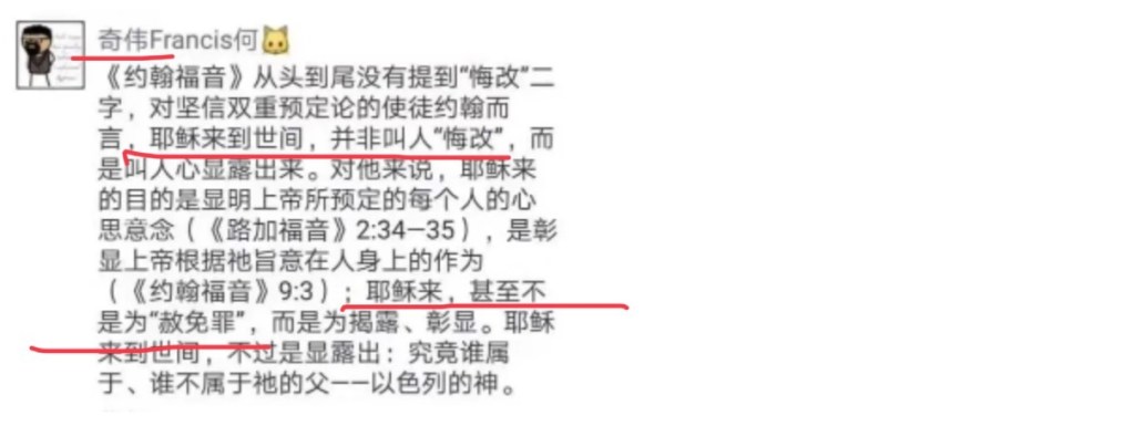 有些人认为何奇伟颇有学识的样子,所以不少人就在微信群里以他为师。但是从何奇伟所发表的一些文章和言论来看,他基本上是停留在一些教义、教理、信条、宗派、教会历史、神学家这类的问题上,而不是深入到圣经里去学习和明白神的话语。由于他已确立了自己的宗派和教义,并把这些教义绝对化,认为自己的宗派才是最正统的。这就使得他对圣经的解释非常容易带上宗派的特色,总想把圣经解释得合乎他自己的观点和立场,而不是让圣经来纠正自己的观点,以致误解和误用圣经。比如,他甚至说,耶稣来到世间并非叫人悔改,甚至也不是为了赦罪。他的原话见下图: