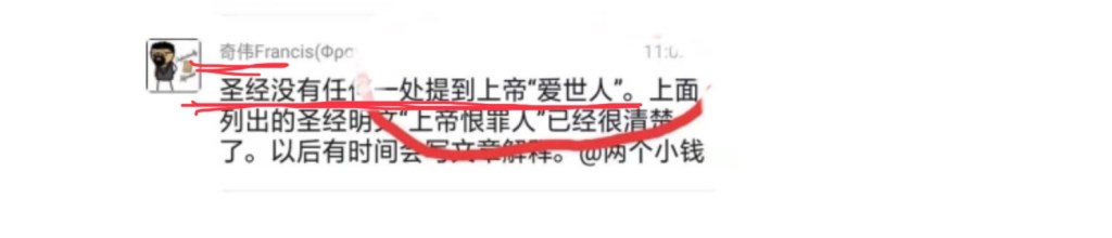 更荒唐的是,何奇伟还说,“圣经没有任何一处提到‘上帝爱世人’。。。”,见下面他的原话截图: