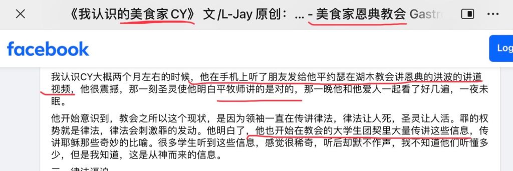 写这篇文章的时候,我已经认识船长CY二年零四个月了。。。CY比我大7岁。讲起我和他是如何认识的,这要追溯到 2016年 4月份。。。我认识CY大概两个月左右的时候,他在手机上听了朋友发给他平约瑟在湖木教会讲恩典的洪波的讲道视频,他很震撼,那一刻圣灵使他明白平牧师讲的是对的,那一晚他和他爱人一起看了好几遍,一夜未眠。他开始意识到,教会之所以这个现状,是因为领袖一直在传讲律法,律法让人死,圣灵让人活。罪的权势就是律法,律法会刺激罪的发动。他明白了,他也开始在教会的大学生团契里大量传讲这些信息。。。” 原文截图如下: