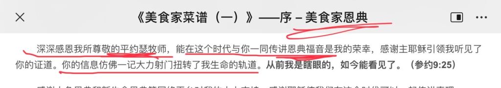 深深感恩我所尊敬的平约瑟牧师能在这个时代与你一同传讲恩典福音是我的荣幸,感谢主耶稣引领我听见了你的证道。你的信息仿佛一记大力射门扭转了我生命的轨道。” 原文截图如下,