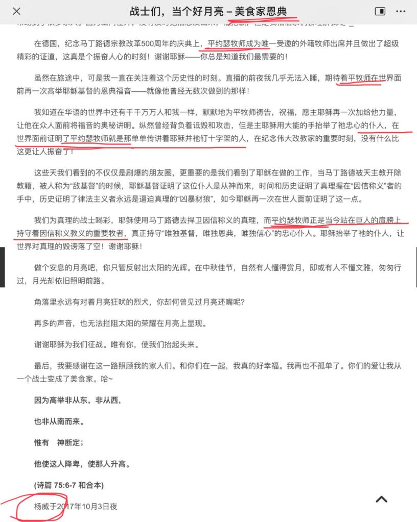 附图:CY/杨威/美食家恩典教会的《战士们,当个好月亮》一文截图