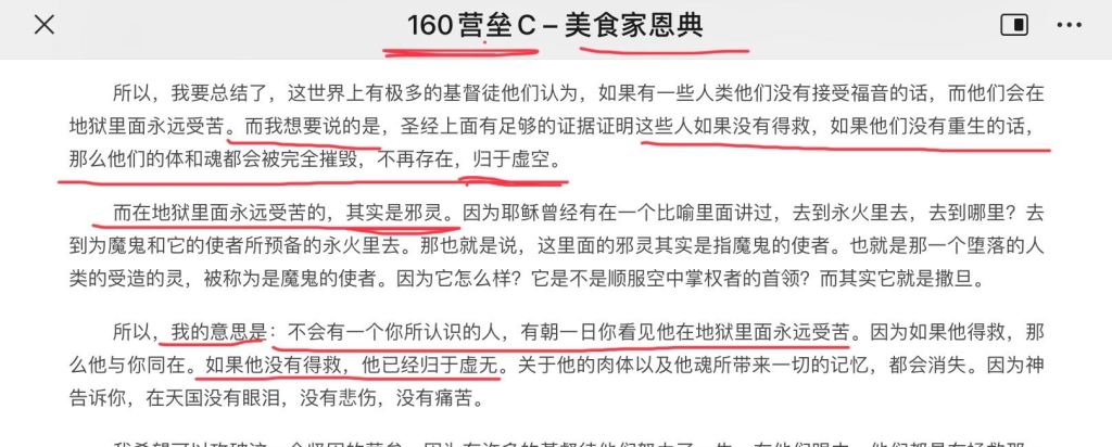在CY的《营垒C》一文里,他认为不得救的人并不会下地狱,而只是不再存在,归于虚空。这种消亡论的观点完全与主耶稣所说的相反,是来自安息日会、耶和华见证人这种异端所持的观点。主耶稣说,“这些人要往永刑里去,那些义人要往永生里去。”(太25:46)所以,不得救的人是往永刑里去,是永远的刑罚,而不是往虚空里去。CY所讲的这种消亡论的原文部分截图如下,
