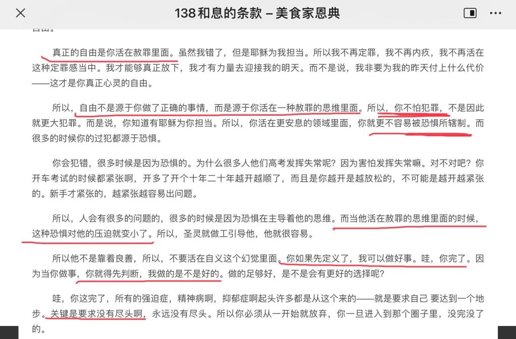 真正的自由是你活在赦罪里面。虽然我错了,但是耶稣为我担当。所以我不再定罪,我不再内疚,我不再活在这种定罪感当中。我才能够真正放下,我才有力量去迎接我的明天。而不是说,我非要为我的昨天付上什么代价——这才是你真正心灵的自由。。。所以,自由不是源于你做了正确的事情,而是源于你活在一种赦罪的思维里面。所以,你不怕犯罪,不是因此就更大犯罪。而是说,你知道有耶稣为你担当。所以,你活在更安息的领域里面,你就更不容易被恐惧所辖制。而很多的时候你的过犯都源于恐惧。” 原文截图如下,