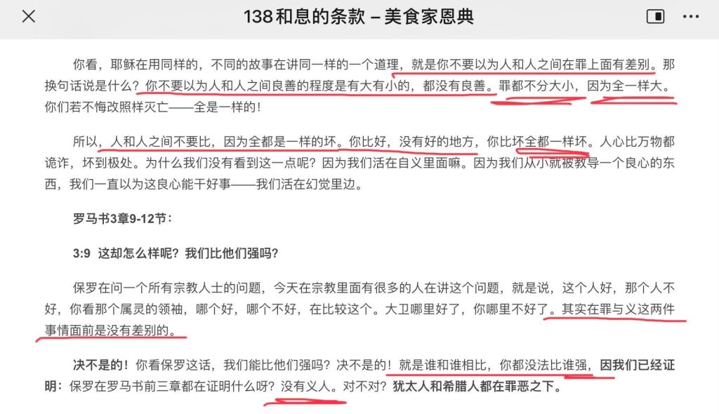 你不要以为人和人之间在罪上面有差别。那换句话说是什么?你不要以为人和人之间良善的程度是有大有小的,都没有良善。罪都不分大小,因为全一样大。你们若不悔改照样灭亡——全是一样的!所以,人和人之间不要比,因为全都是一样的坏。你比好,没有好的地方,你比坏全都一样坏。。。其实在罪与义这两件事情面前是没有差别的。决不是的!你看保罗这话,我们能比他们强吗?决不是的!就是谁和谁相比,你都没法比谁强,因我们已经证明:保罗在罗马书前三章都在证明什么呀?没有义人。对不对?犹太人和希腊人都在罪恶之下。”  原文截图如下,