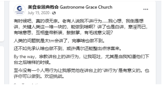 老有人说我不讲行为……我心想,我倒是想讲,关键人类这一堆一块的,能做到啥啊?讲了也是白讲。。。宗教讲台上的讲行为,让我呕吐,尤其是当我知道他们下台之后啥样的时候。至今没有一个人用行为让我感觉他在讲台上的“讲行为”是有意义的。” 截图如下,