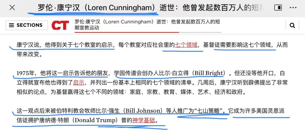 “康宁汉说,他得到关于七个教室的启示,每个教室对应社会里的七个领域,基督徒需要影响这七个领域,从而带来改变。1975年,他将这一启示告诉他的朋友,学园传道会创办人比尔·白立得(Bill Bright)。但还没等他开口,白立得就宣布他也得到了启示,并列出一份基本上相同的七个领域的清单。几周后,康宁汉听到薛佛提出了非常相似的论点,为基督赢得这七个不同的领域:家庭、宗教、教育、媒体、艺术、经济和政府。这一观点后来被伯特利教会牧师比尔·强生(Bill Johnson)等人推广为“七山策略”。它成为许多美国灵恩派信徒拥护唐纳德·特朗普(Donald Trump)的神学基础。”