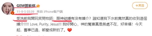 邓紫棋把受洗说成是与主耶稣结婚,当时她在微博上说是与神结婚。她说,“受洗前我开玩笑问牧师,跟神结婚有没有婚介?” 见下面截图: