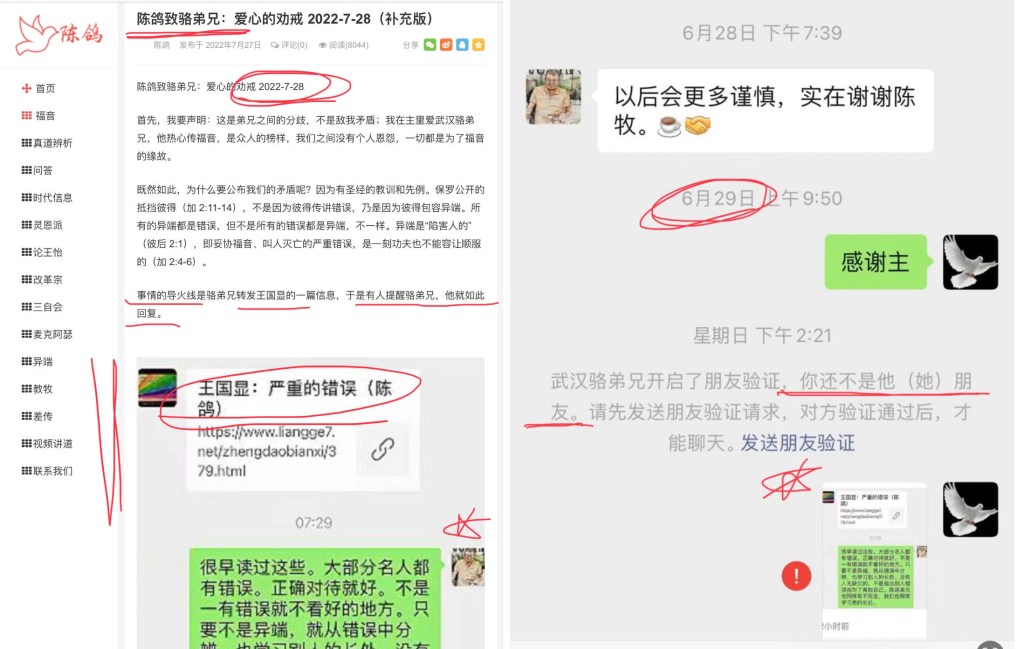 事实是,陈鸽在2022年7月28日发表《陈鸽致骆弟兄:爱心的劝戒 2022-7-28(补充版) – 陈鸽 (liangge7.net) 》这篇文章前,确实有托人去找骆传道,希望能和骆传道交通,因为正是在那时,陈鸽发现骆传道把他拉黑了。