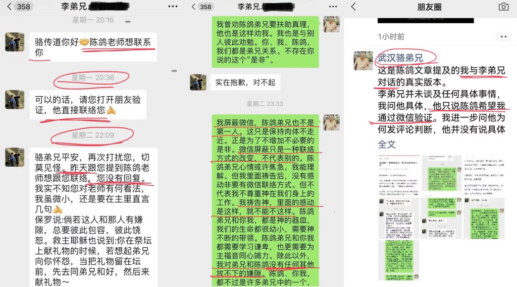 陈鸽就因此委托李弟兄去转告骆传道,说想和他联系。下面就是李弟兄与骆传道当时的部分对话截图,是骆传道自己公开出来在他的朋友圈里。所以陈鸽在发文前确实有托人去找骆传道,说想和他联系,但骆传道自己坚决拒绝与陈鸽联系。