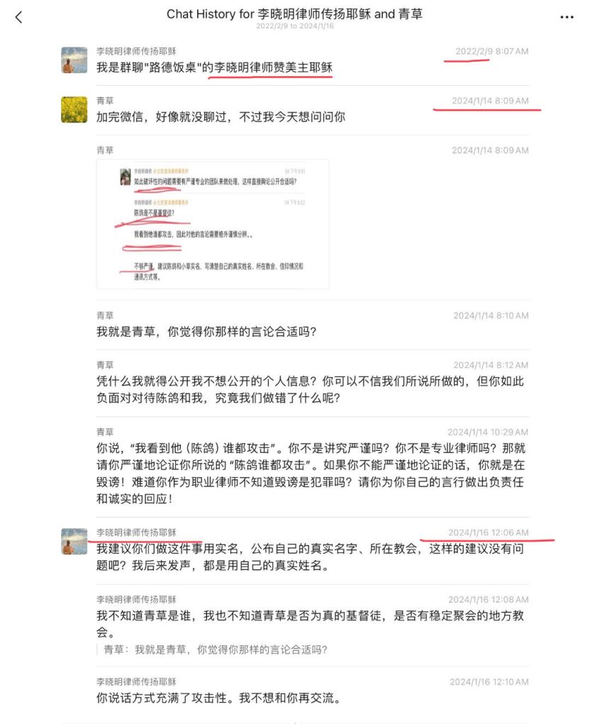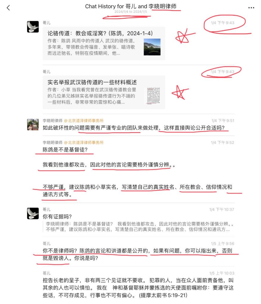 2024年1月4日,陈鸽和我发表了数位实名举报人揭发骆某人长期犯罪的两篇文章《论骆传道:教会或淫窝?(陈鸽,2024-1-4)》和《实名举报武汉骆传道的一些材料概述》。李晓明律师看到后,马上就说了下面这些话,