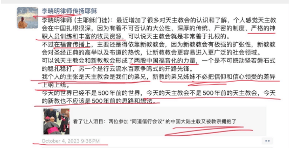 李晓明在最初对陈鸽和我的质问中,还建议我们要给出信仰情况。既然他这么在乎信仰情况,那就来看看他自己的信仰情况吧!2023年10月4日,他在他的朋友圈里转发了一篇有关天主教会议的文章,题为:《看了让人泪目:两位参加“同道偕行会议”的中国大陆主教又被教宗拥抱了》,并附了一段他自己的评语,截图如下: