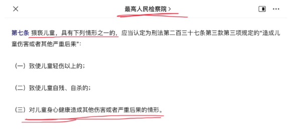 这种集体淫乱的犯罪行为,即使未伤害到未成年人,也属于极端的邪恶、荒淫无耻!有伤社会风化,严重触犯刑法,理应受到法律制裁,见下面的《最高人民检查院》有关 “对儿童身心健康造成其他伤害或者严重后果的情形” 的刑法条款截图: