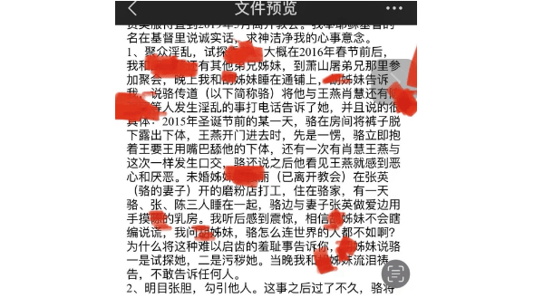 其中还有一个我认识的王燕 “姊妹”,竟然当众与骆两个人实施乱交,被称为弟兄姊妹的他们,竟然做出如此狗男女的勾当,实在大大亵渎了神,羞辱了主名!下面就是截自一份举报材料的内容: