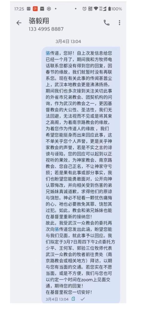 关于向众教会报告调查主内肢体指控武汉南京路教会牧者骆毅祥犯罪(奸淫、聚众淫乱、猥亵未成年少女)一事的第二封公开信
