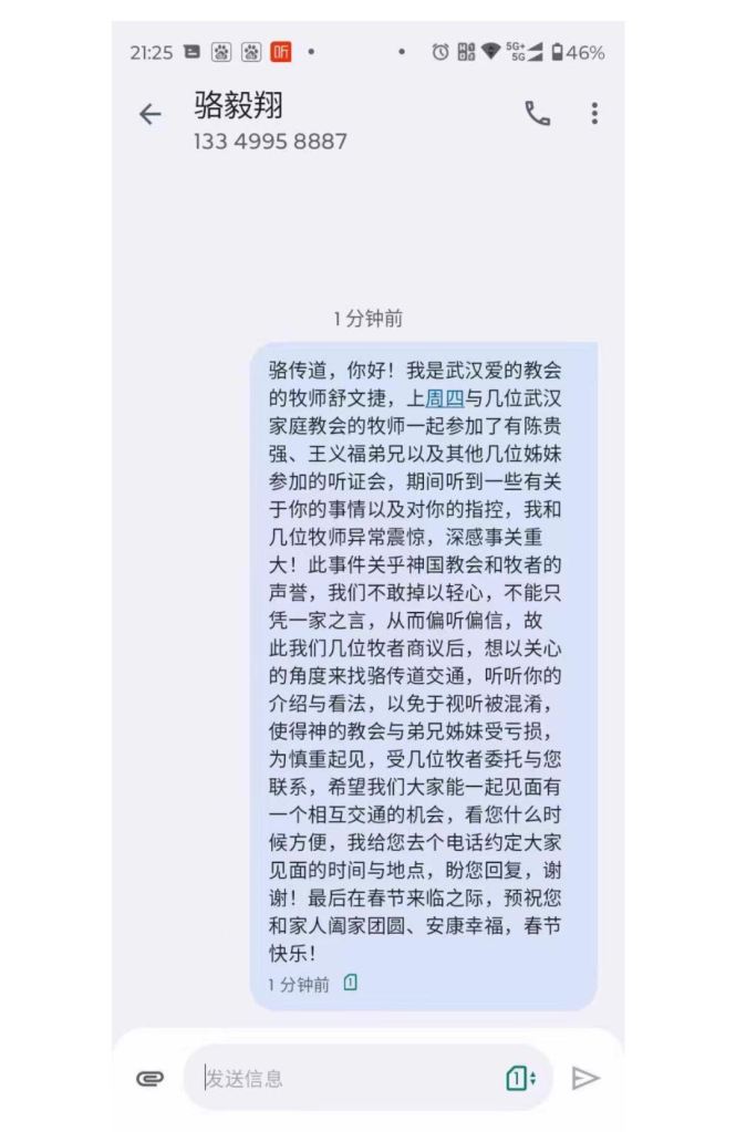 舒牧师再次短信邀约(总计第三次)骆毅祥,依然没有任何回应。