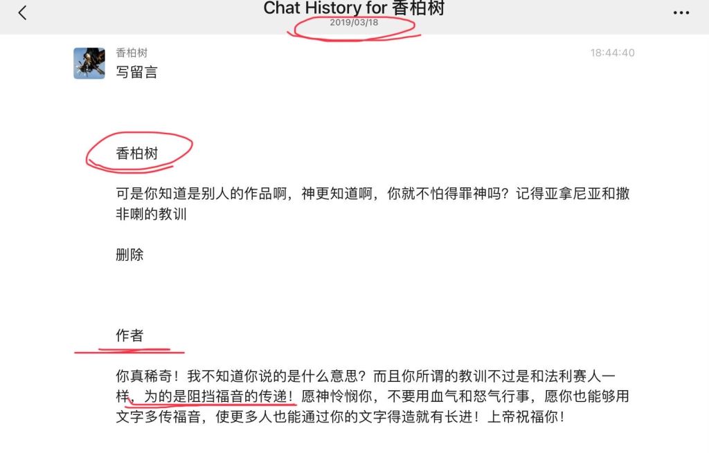 2019年3月18日 香柏树与王斌(作者)在公号留言处的部分对话: