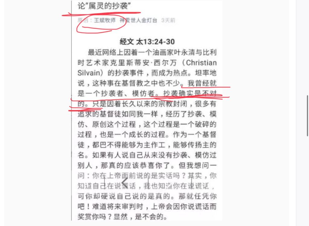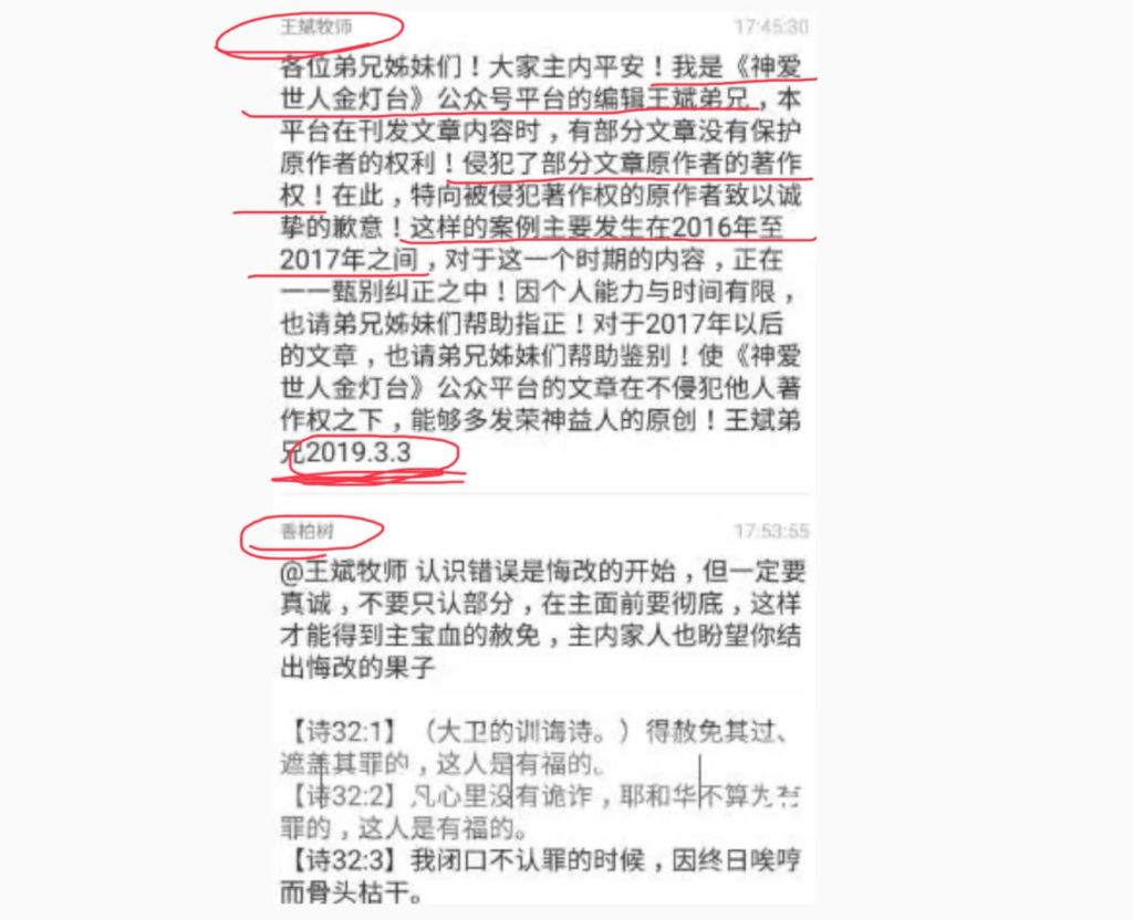 注(2024年4月18日):此文发表后,香柏树弟兄对我说,2019年他也参与了对王斌的抄袭行为的揭发,并提供了他当时与王斌的一些对话。我也从网上搜到了香柏树弟兄告诉我的,王斌曾经就他的抄袭所写的《论“属灵的抄袭”》短文的截图,以及他曾经对自己抄袭行为的承认。但显然的,承认只不过是表面上的应付而已,所以我在2020年8月发现他的公号里还有很多抄袭的文字。下面就把这些截图附在下面,作为证据。