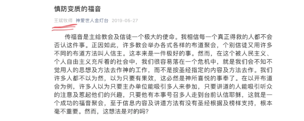 2019-05-27 王斌在他的公号里发表了署名为“王斌牧师”的《慎防变质的福音》,下面是文章头部的截图。