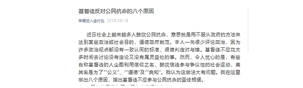 另一篇是2018-09-18发表在王斌公号上的《基督徒反对公民抗命的八个原因》,下面是截图: