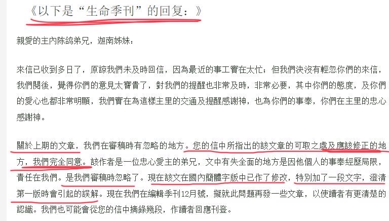 陈鸽在2003年11月11日就给生命季刊的主编屈儆聆和王峙军发了一封信,针对这篇文章《海外教会当如何看待“三自”和教会》所说的“独立教会”提出了严重的质疑,具体的可参阅《陈鸽对生命季刊早年的劝戒(书信留底)》。根据陈鸽这篇文章的记录,2003年12月03日,生命季刊回复了陈鸽,并表示对陈鸽的意见完全同意,同时说已经对该文章的简体版作了修改,这段文字截图如下: