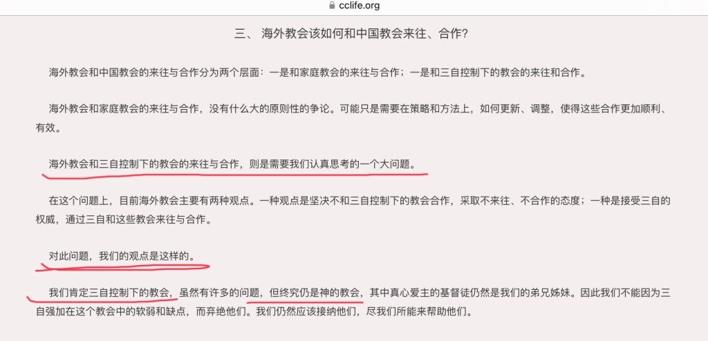 无论当时(2003年11月或12月)生命季刊有无对这篇文章作了什么修改,我现在所看到的2015年生命季刊重发的《海外教会当如何看待“三自”和教会》的简体版,还是用了大量的篇幅在为登记的教会正名和申辩。基于这样的申辩,作者说,
