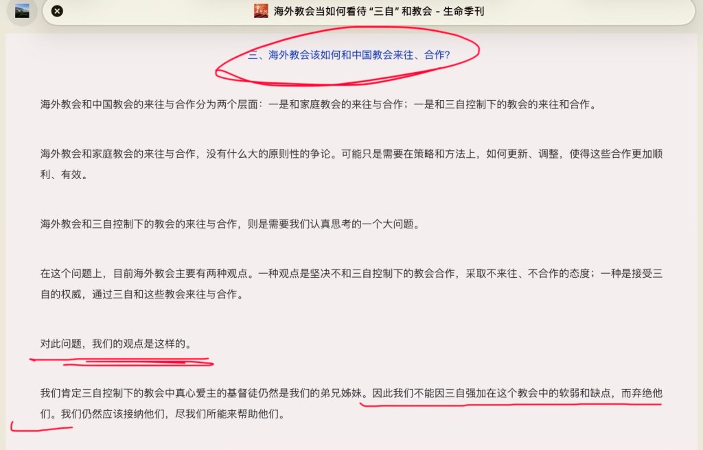 2026年2月15日注:前几天发现季刊修改了《海外教会当如何看待“三自”和教会》这篇文章,这句话“我们肯定三自控制下的教会,虽然有许多的问题,但终究仍是神的教会。” 被删除了,现在的版本看起来是下面截图所显示的样子:
