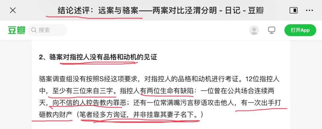 “骆案调查组没有按照S经这项要求,对指控人的品格和动机进行考证。12位指控人中,至少有三位来自三字。指控人有两位生命有缺陷:一位曾在公共场合连续两天,向不信的人控告教内罪恶;还有一位常满嘴污言秽语攻击他人,有一次出手打砸教内财产(笔者经多方询证,并非挂靠其妻子名下。)”